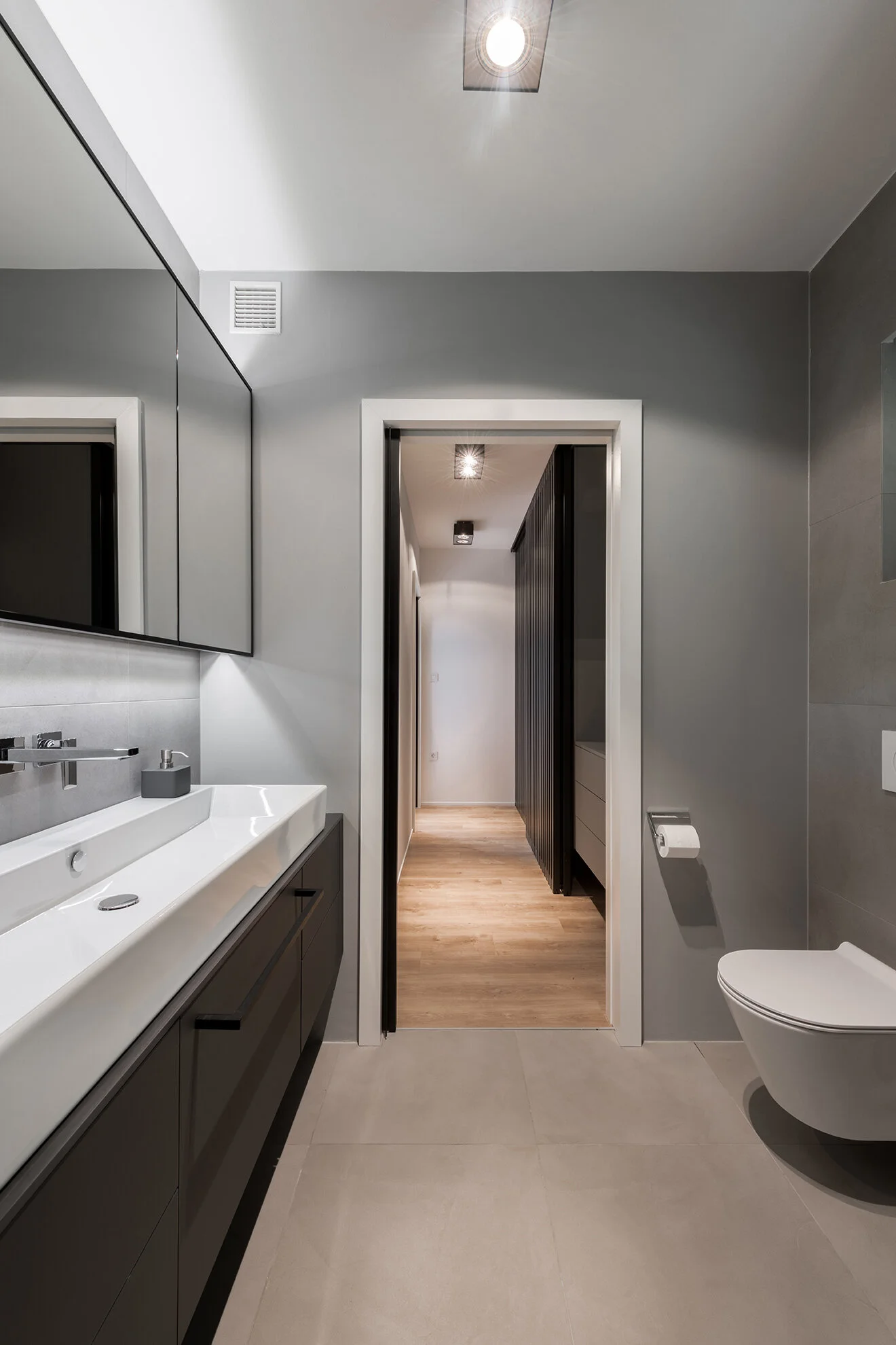 The architecture of silence. A self-sufficient and self-sustainable living right off the forest clearing. Renovation of the ambiance in the family house is designed individually for the needs and tastes of the user. Post-modernist orientation is the form that takes in the elements of previous periods, especially from modernism, while incorporating an authorial character. In addition to the predominance of basic forms and clean lines, light, natural and artificial factors play an important part within space.